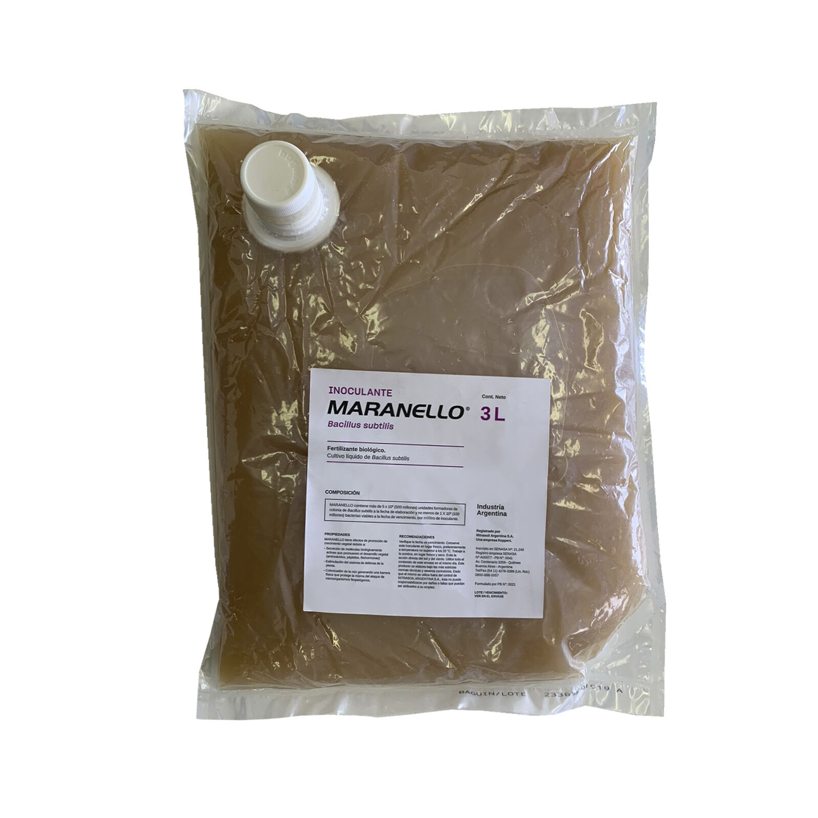 500 ml volumen de aplicación para la inoculación sólo con Maranello. - Dosis en soja: 150 ml de Maranello para 50 kg de semilla.