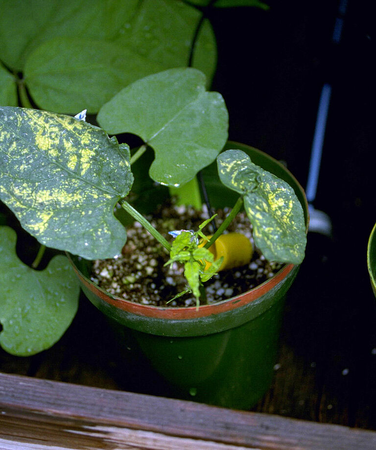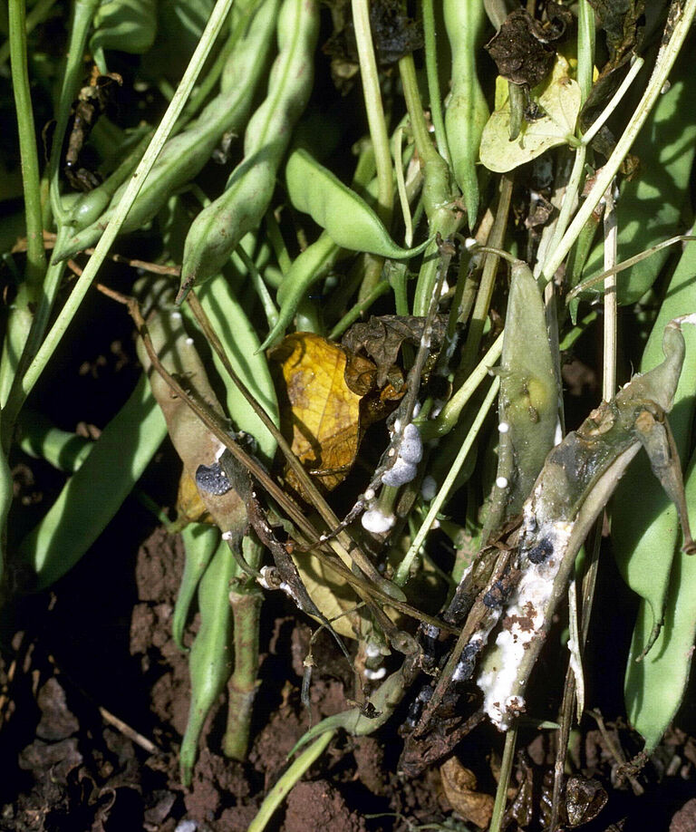 Los primeros síntomas de una infección de moho blanco (Sclerotinia sclerotiorum) son lesiones llenas de agua en la base del tallo. La parte de la planta situada por encima se marchita y pudre. En las lesiones crecen micelios fúngicos algodonosos y blancos, de allí el nombre de la enfermedad. En el micelio se forman esclerocios oscuros y grandes. Se observan a simple vista y parecen excrementos de ratas. Los síntomas pueden ocurrir en los tallos, pero también en las hojas, los frutos y las vainas.
