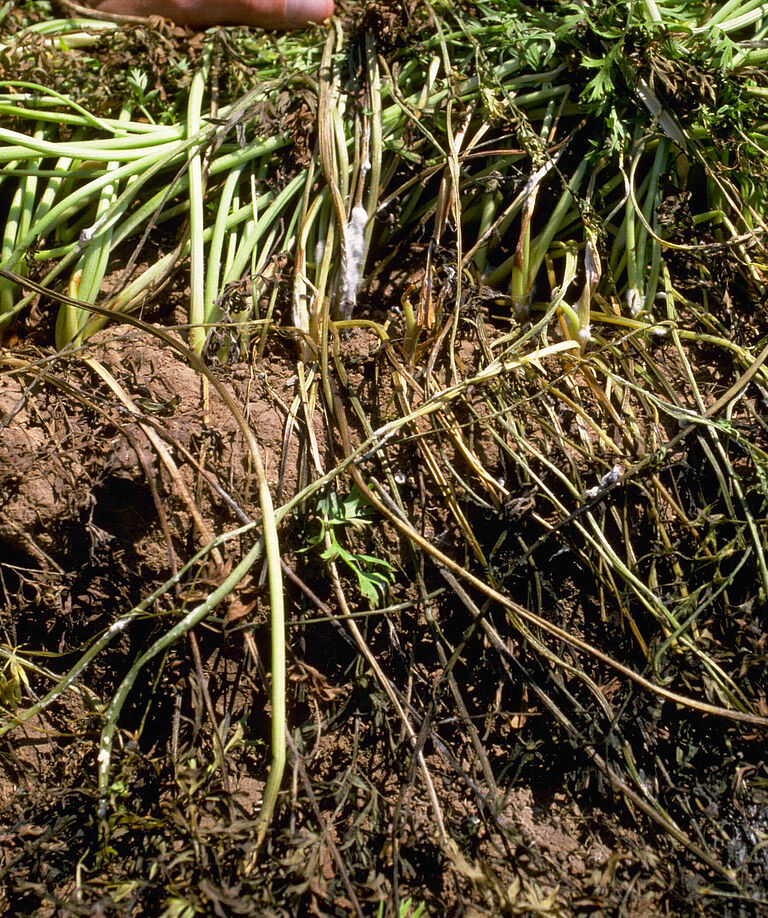 La infección radicular suele provocar un marchitamiento y muerte prematuros de las plantas.