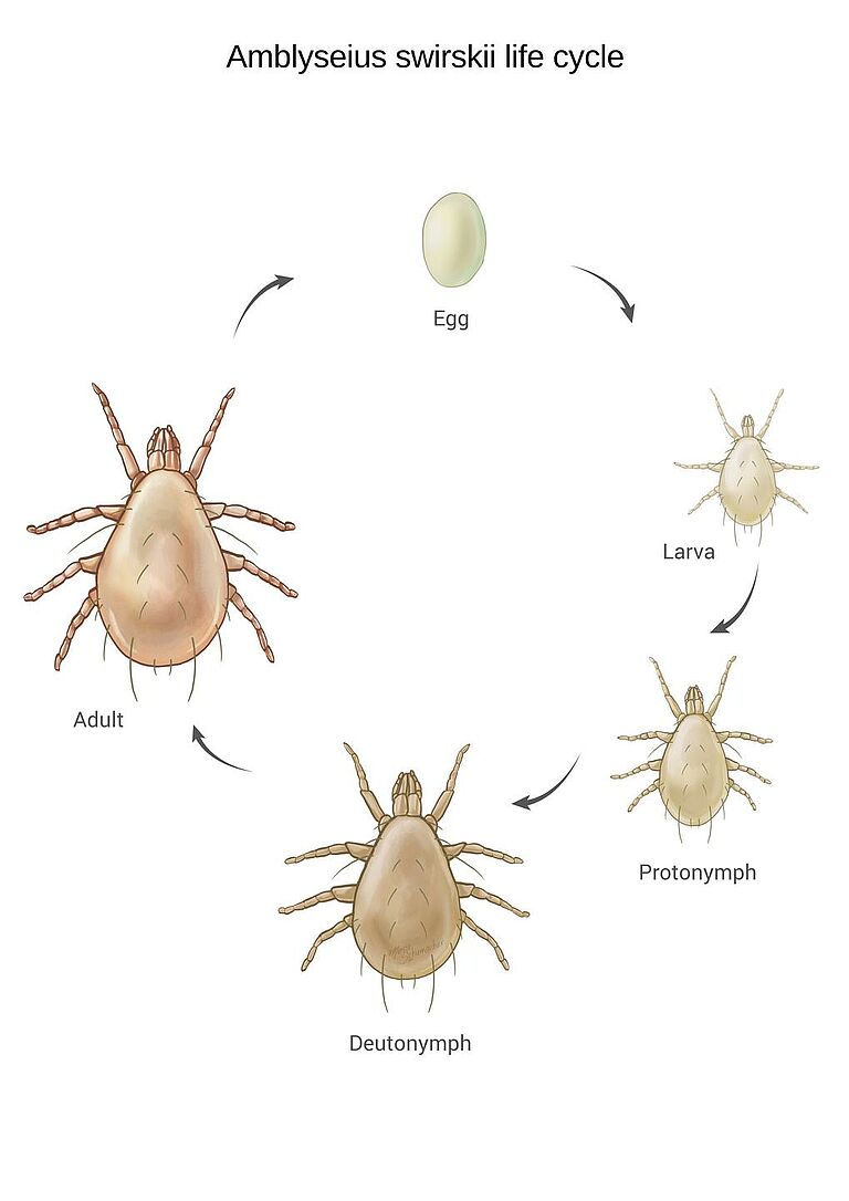El ciclo vital de los ácaros depredadores consta de cinco fases de desarrollo: huevo, larva, protoninfa, deutoninfa y adulto. Los ácaros depredadores ponen sus huevos cerca de zonas infestadas de plagas. Las larvas tienen tres pares de patas. Dependiendo de la especie de ácaro depredador, las larvas son activas o inactivas. Una vez que la larva ha mudado a la fase protoninfa (con cuatro pares de patas), comienza a alimentarse inmediatamente. Durante las fases protoninfa, deutoninfa y adulta, los ácaros se alimentan casi continuamente. Las protoninfas y deutoninfas son similares a los adultos en aspecto, pero de menor tamaño.